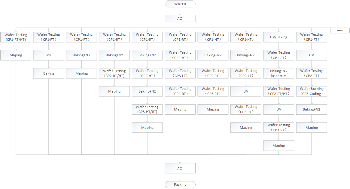 Wafer testing is a needle measurement of each grain on a wafer to test its electrical properties. During the test, the wafer is fixed on the tray of the probe, and the probe is in contact with each PAD point of the chip. The tester performs electrical and functional tests on the chip and records the results to distinguish the good ones from the bad ones. With 12″, 8″, 6″, 5″and 4″ wafer testing capabilities, including advanced processes such as 17nm, 22nm, 28nm and full mature processes for wafers above 28nm. Can test fingerprint identification, fire safety, Bluetooth, power management, MCU, filter, optical communication and many other application types.