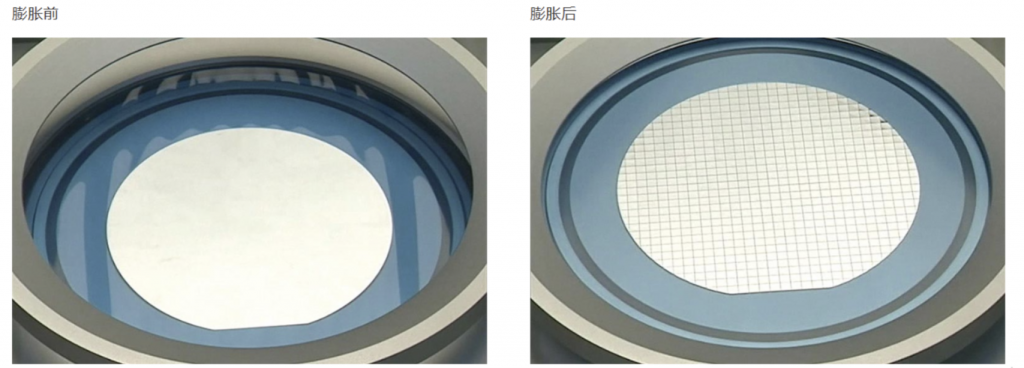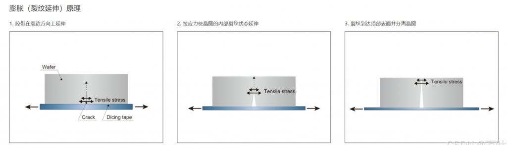 通過膠帶膨脹等行為在周邊方向上拉緊膠帶,對已形成 SD 層的晶圓施加外力。這會對晶圓的內部裂紋狀態施加拉應力,并使裂紋延伸到頂部和底部表面,從而分離晶片。由于晶圓分離是通過延伸裂紋進行的,因此沒有應力施加在器件上。此外,由于基本上沒有截口損失,這會提高芯片成品率。