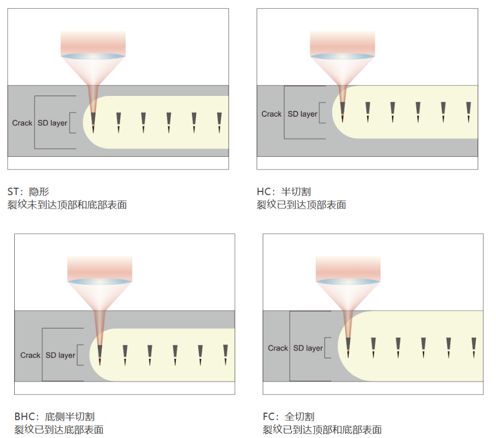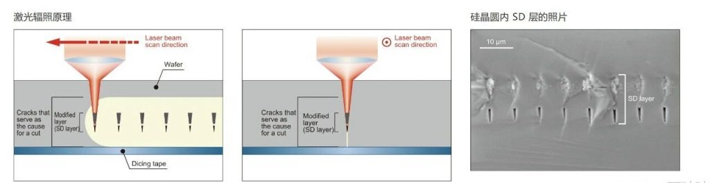 裂紋也從 SD 層形成,而 SD 層在內部朝向晶圓的頂部和底部表面形成,這些裂紋通過激光光束掃描沿著計劃的切割線連接。此外,為了切割 MEMS 器件等厚晶圓,在厚度方向上形成多個 SD 層,然后連接裂紋。