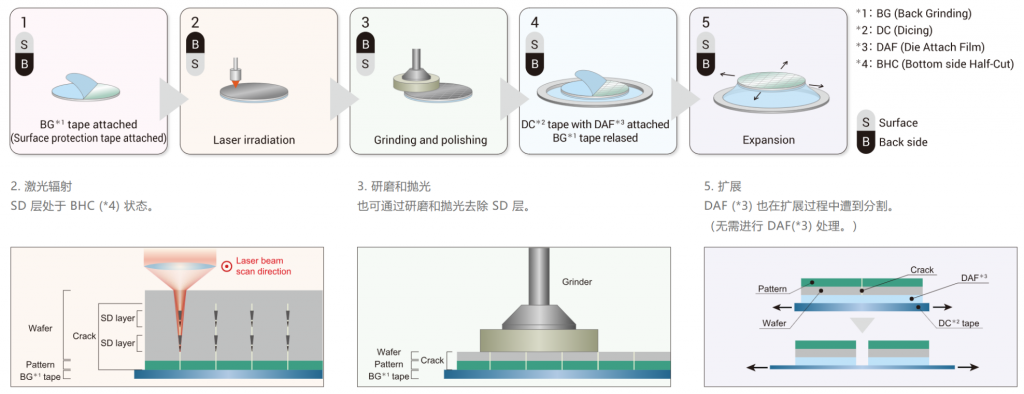 隱形切割技術可將能夠穿透材料的波長的激光光束聚焦,在內部聚焦并形成晶圓破裂的起點(改性層:隱形切割層,以下稱為“SD 層”),然后向晶圓施加外部應力,將其分離。該過程主要由兩部分組成,一般被稱為激光改制過程與晶圓擴展分離過程,